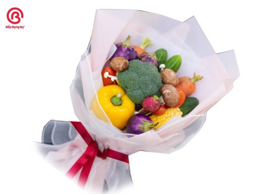 – Thành phần: Gồm 8 -10 loại rau củ: Dưa chuột, cà rốt, cà tím, nấm, ớt chuông, ngô ngọt….thiết kế như 1 bó hoa xinh xắn.